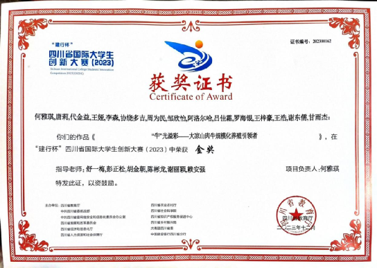 3、2023年12月获得第九届四川省国际“互联网+”大学生创新创业省级金奖。