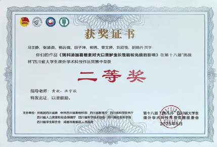 在刚刚结束的第十八届“挑战杯”全国大学生课外学术科技作品竞赛中,我院水产养殖专业学生团队凭借论文《饲料添加葛根素对大口黑鲈生长性能和免疫的影响》,在自然科学类学术论文竞赛中脱颖而出,荣获省二等奖。